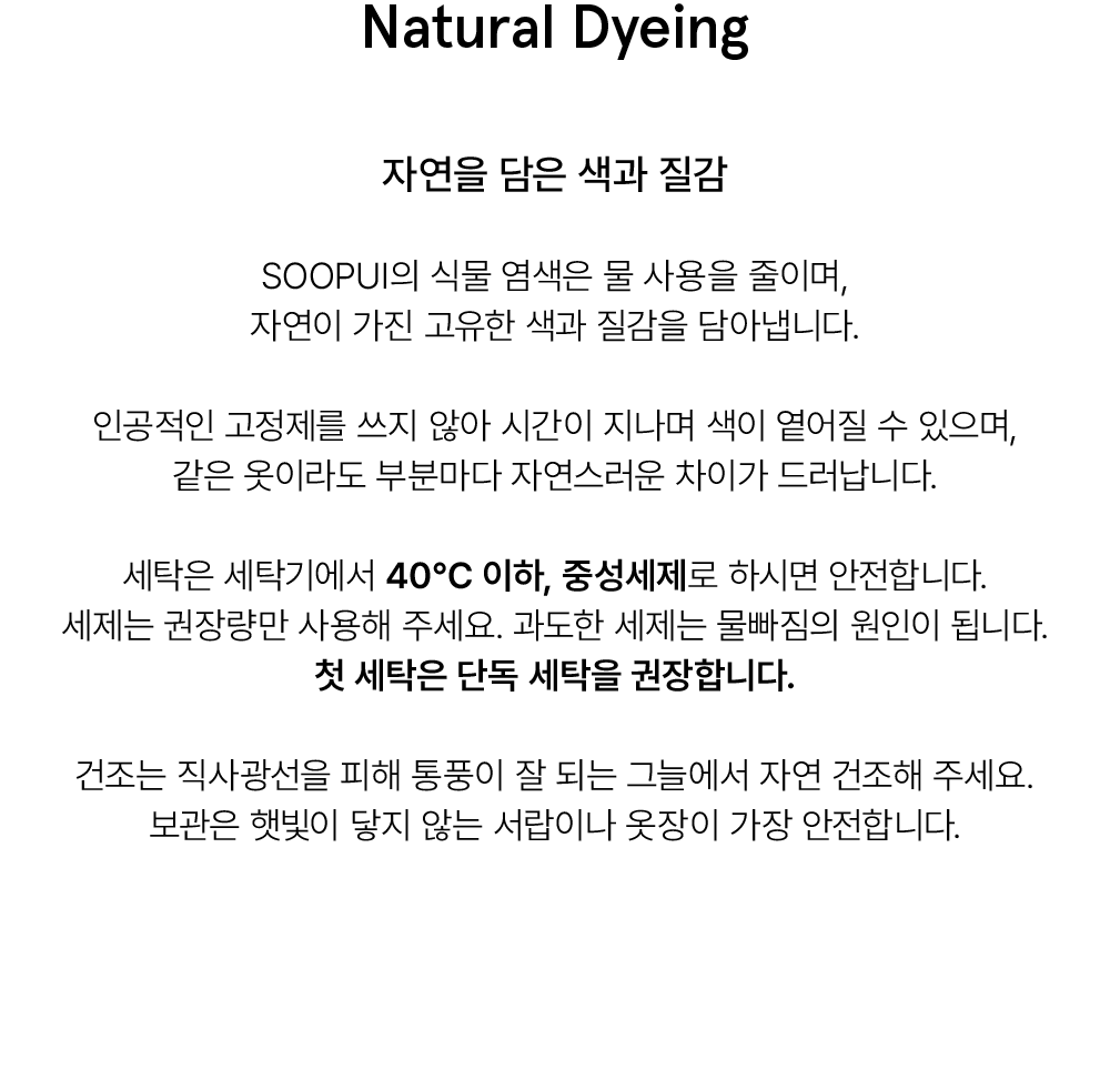 화학 고정제를 사용하지 않아, 시간이 지나며 조금씩 옅어지는 변화가 자연스럽게 드러납니다. 이 흐름은 원단이 가진 특징이자, 자연 염색만의 매력입니다.