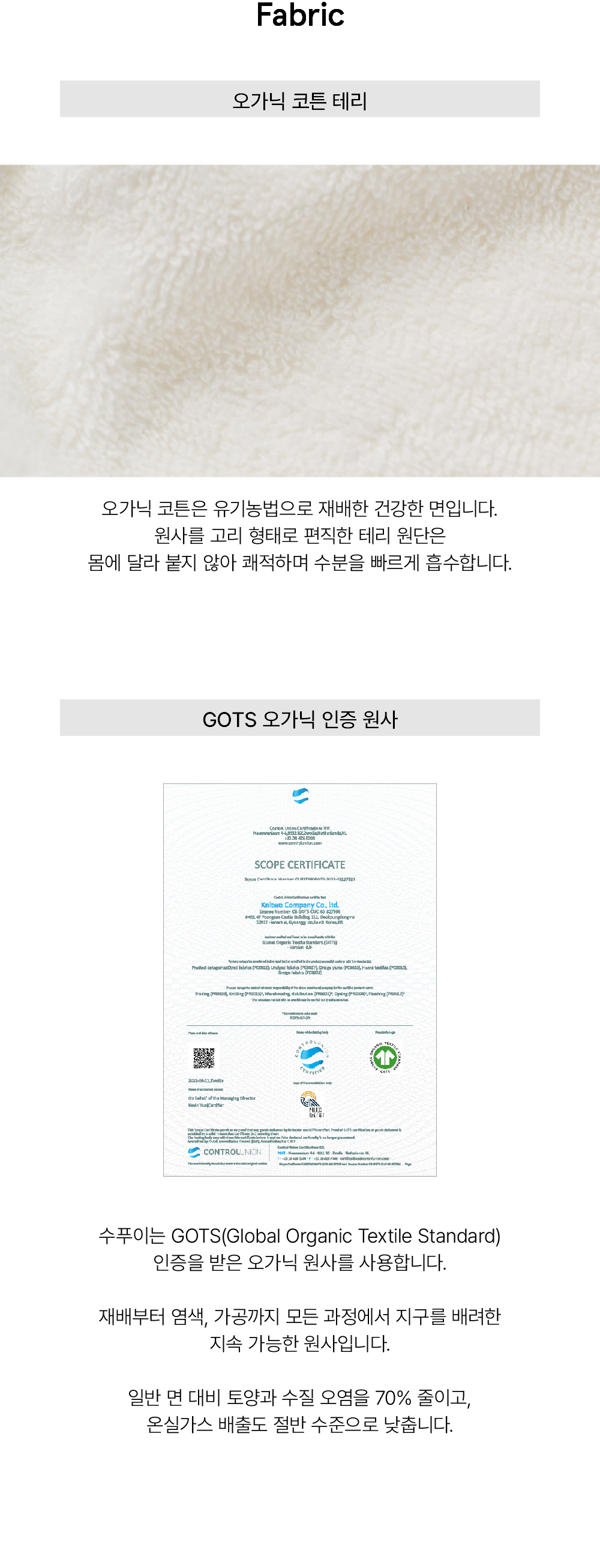 몸에 잘 달라붙지 않는 부드럽고 보송한 촉감이 특징입니다.