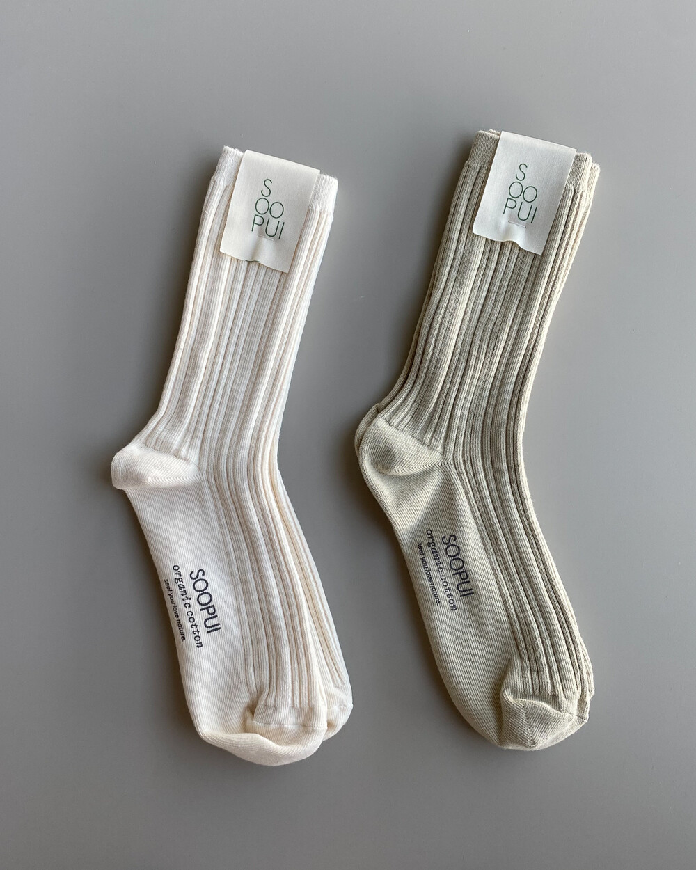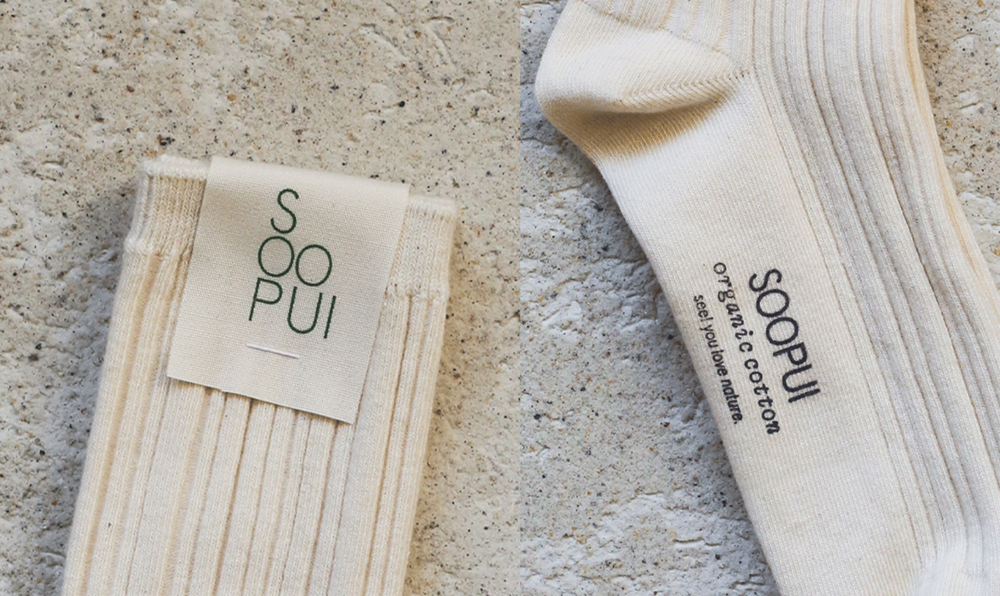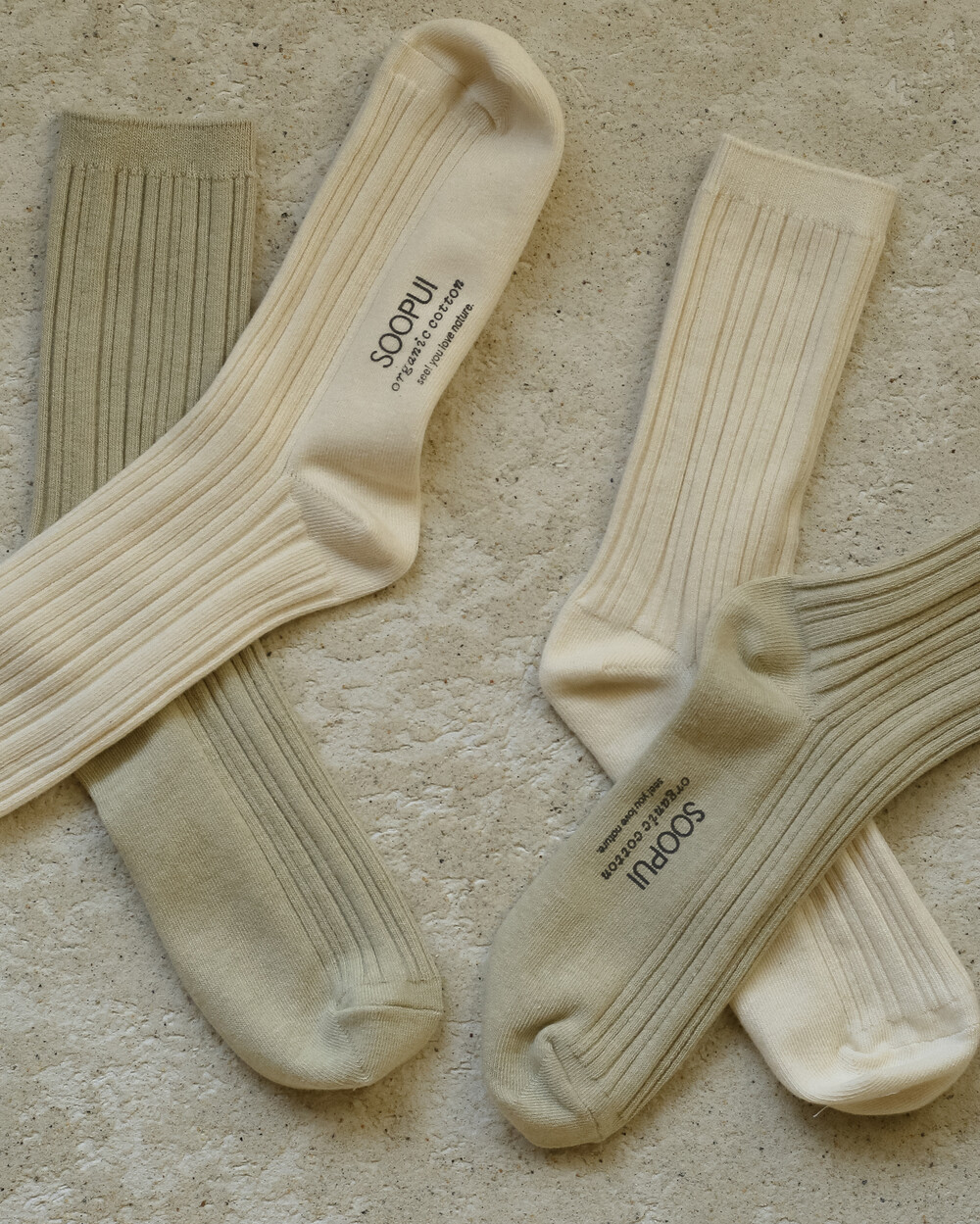 수푸이의 로우 그린 양말은 염색하지 않은 자연 목화솜 그대로를 사용했습니다. 오가닉 코튼은 화이트 외에도 그린, 브라운 등의 품종이 있습니다. 자연의 색감 그대로 진하지 않아 옷에도 자연스럽게 매치됩니다.
