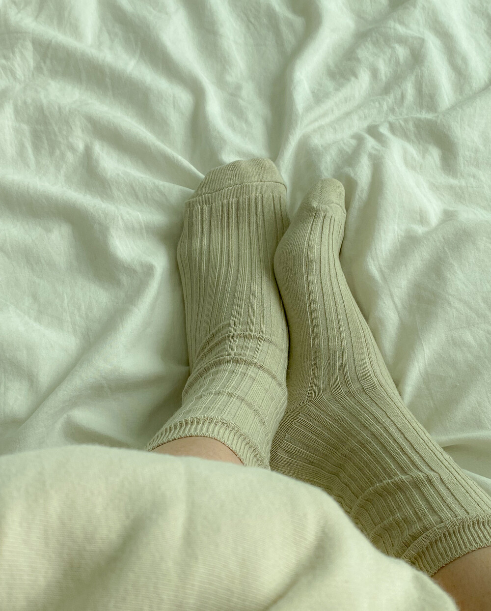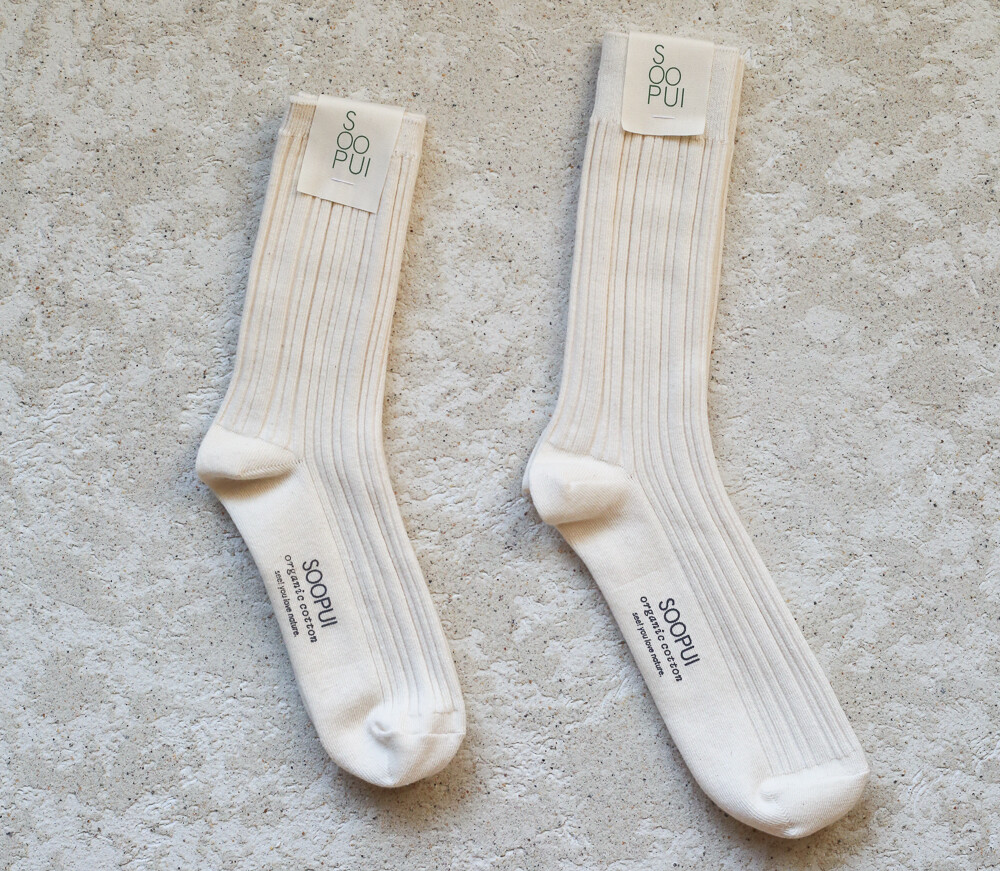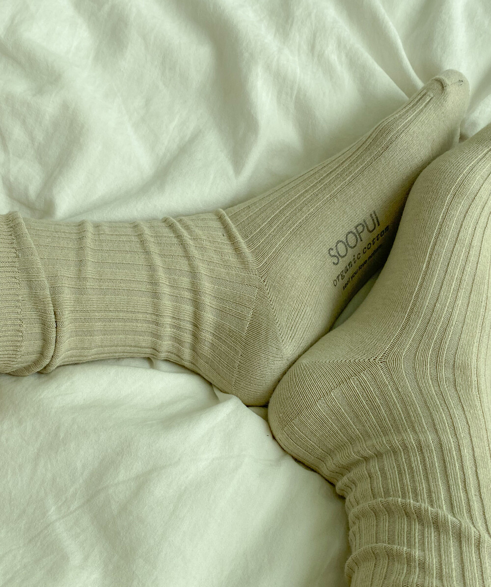 수푸이의 로우 그린 양말은 염색하지 않은 자연 목화솜 그대로를 사용했습니다. 오가닉 코튼은 화이트 외에도 그린, 브라운 등의 품종이 있습니다. 자연의 색감 그대로 진하지 않아 옷에도 자연스럽게 매치됩니다.